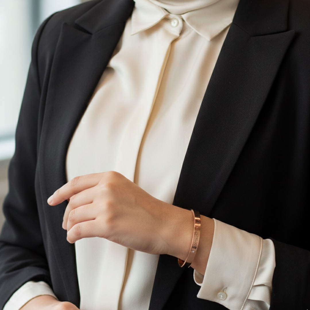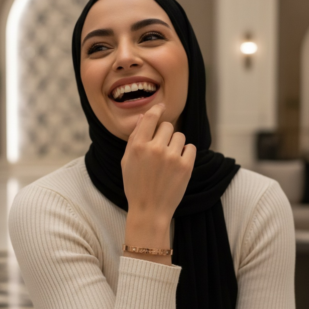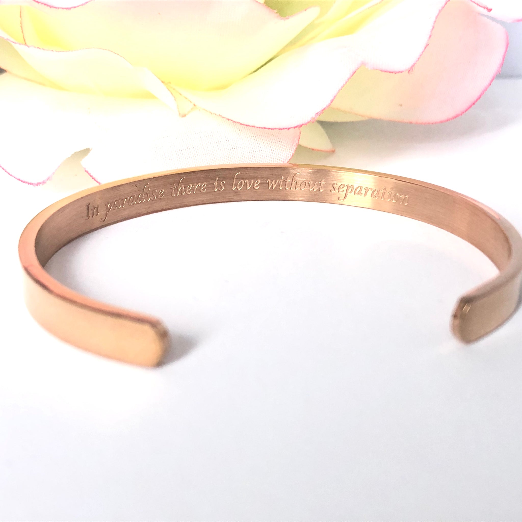 This special cuff is charmingly engraved with the Arabic proverb “In paradise there is love without separation”.  The outside of the cuff is engraved with delicate Arabic lettering and the inside of the cuff is engraved with the English meaning, making this a very unusual piece and a definite conversation starter.