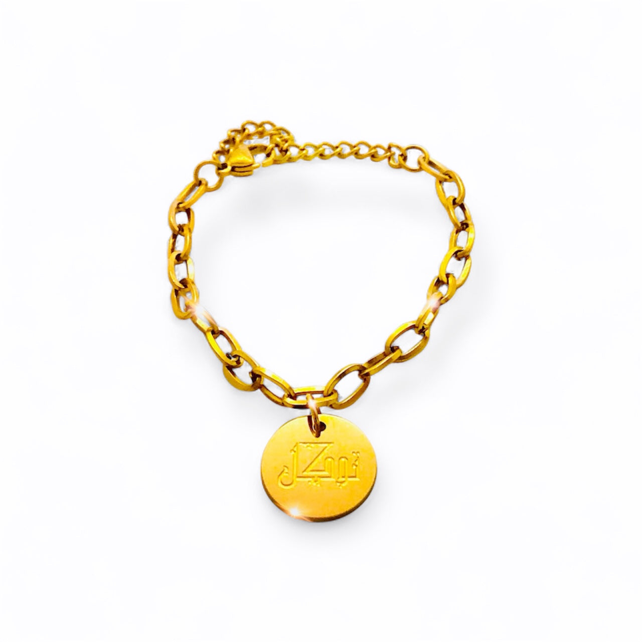 This stunning bracelet has a contemporary link chain design with a beautifully engraved charm dangling alluringly off the wrist. The charm has the Arabic word “Tawakkul” engraved on it in an artistic calligraphy design.