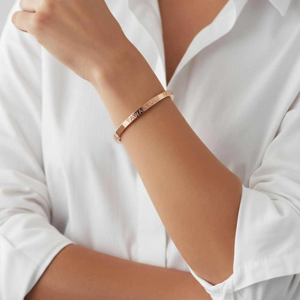 This elegant and contemporary cuff bangle has a timely reminder about 'Tawakkul' which is having reliance and trust in Allah (God) alone. The Arabic word 'Tawakkul' is engraved into the exquisite and rich rose gold of the bangle.