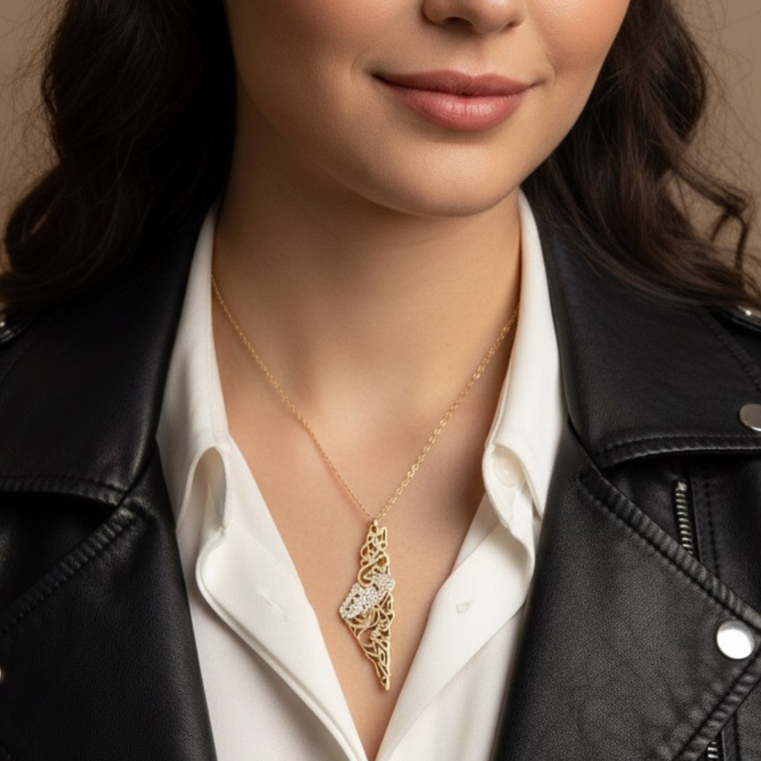 Our Palestine map necklace has a shower of delicate shimmering Cubic Zirconia crystals running across it which spell the word 'Falasteen' (Palestine).